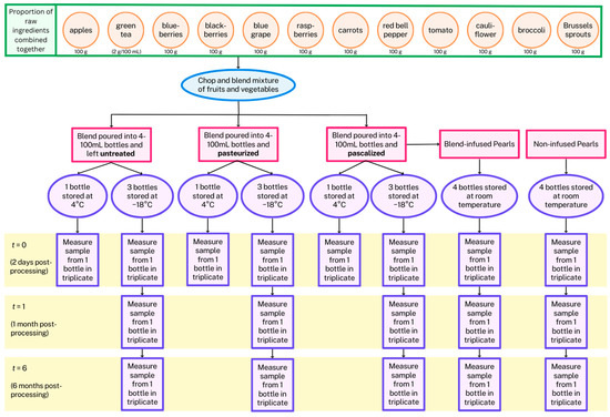 Flowchart of the experiment to test the impact of processing and storage conditions on phytochemical extractability in a complex mixture of fruits and vegetables.