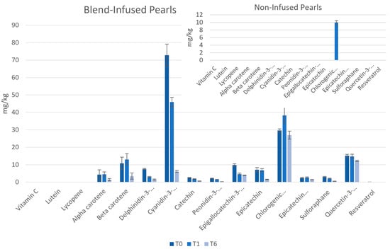 Bioactive content and stability in blend-infused and non-infused Pearls. All phytochemicals were measured in mg/kg. T0 = time 0, T1 = one month, and T6 = six months. Vitamin C was measured in mg/kg. The only phytochemical detected in the non-infused pearls was chlorogenic acid.