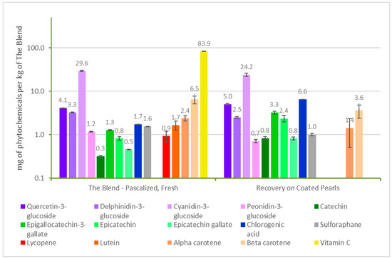 The blend in whole food and dry food formats. The phytochemical content of the fresh, pascalized fruit and vegetable blend are compared with the phytochemical content found in the same amount by weight of pascalized fruit and vegetable coating added to the Pearls. The chlorogenic acid levels contained in the oat–rice mixture portion of the Pearls were controlled for. All phytochemicals are measured in mg/kg and data are presented on a logarithmic scale.