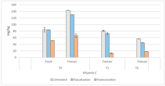 Fresh, untreated, and pascalized samples did not differ in vitamin C content after processing, whereas pasteurized samples decreased by 39%. For samples which were immediately frozen and defrosted after processing, vitamin C concentrations in pascalized and pasteurized samples were 9% and 53% lower than untreated samples, respectively. Freezing and thawing the samples immediately after processing also altered the vitamin C content of all the samples compared with those just kept at 4 °C. Freezing and thawing immediately increased the vitamin C content in all conditions (untreated samples increased by 70%, pascalized by 55%, and pasteurized by 29%).