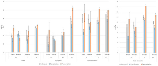 The immediate freezing and thawing of pasteurized samples decreased their concentration by 24–48%, whereas the pascalized samples increased 28–74% for all carotenoid measurements. The untreated samples decreased mildly, less than 5% for all carotenoids after immediate freeze–thawing. For nearly all time points, the pascalized samples contained lower carotenoid concentrations than the untreated samples, whereas the pasteurized samples were higher in carotenoid concentrations than the untreated samples. After one and six months at −18 °C, the pascalized samples increased in carotenoid concentration by 17–50% and 14–103%, respectively, compared with t = 0 (except for lutein at t = 1). The pasteurized samples also increased at one month by 44–84% and at six months by 40–276%. The untreated samples did not differ much at t = 1 compared with t = 0, aside from beta-carotene, which increased 29%. The untreated samples increased similarly to that of the pascalized samples at six months, by 11–105%. The results for carotenoids can be seen in Figure 7.