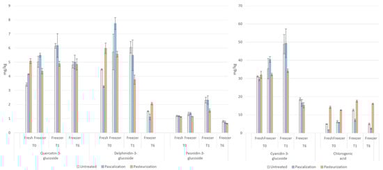Anthocyanins (Cyaninidin-3-glucoside, delphinidin-3-glucoside, peonidin-3-glucoside)—Anthocyanins are abundant flavonoids which give fruits and vegetables their red, purple, blue, and black hues. Their intake has been shown to improve carbohydrate metabolism and decrease the risk of developing metabolic disorders [15,39]. In our study, anthocyanin content increased to a notable degree after immediate freezing and thawing in the pascalized samples (by 37% for cyanindin-3-glucoside, 136% for delphinidin-3-glucoside, and 17% for peonidin-3-glucoside), but had little to no effect on untreated and pasteurized samples, respectively. At one month, both the pascalized and pasteurized samples were higher in anthocyanin content than the untreated samples and to a similar degree (by 44–48%). Most samples, whether pascalized or pasteurized, increased in anthocyanin content at one month (by 9–57%), compared with the untreated samples whose content decreased at one month from t = 0 (by 39–73%). At six months, nearly all the samples of each processing method had decreased below their t = 0 values to similar degrees.