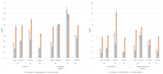 The levels of various catechins in the samples after each processing method and storage time generally followed a similar pattern. As seen in Figure 9, samples that were pasteurized measured highest in various catechins (as much as 157% higher than untreated), except for epicatechin gallate at t = 0 and t = 1 from frozen samples where pascalized samples had the highest content. Immediate freezing and thawing increased various catechin content in all the processed samples. At six months, for samples that underwent the same processing method, all catechins decreased in all samples below that of their frozen t = 0 values.