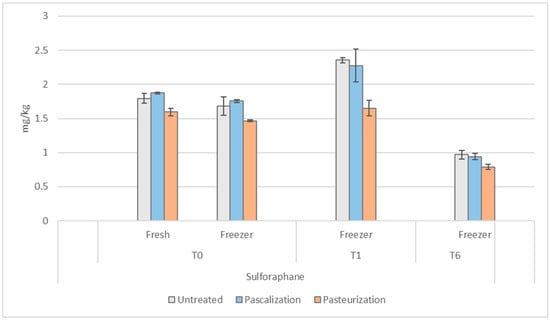 The effect of immediate freezing and thawing on sulforaphane levels was consistent despite the processing method (−6% for pascalized and untreated samples, and −8% for pasteurized) at t = 0, as seen in Figure 10. The pasteurized samples at t = 0 were 11% lower in sulforaphane than the untreated in fresh samples and 13% lower in frozen. At one month in the freezer, the levels of sulforaphane increased in each processing method from t = 0: in the untreated by 18%; in the pascalized by 57%; and in the pasteurized by 94%. At six months, sulforaphane levels in all the samples decreased below their t = 0 levels: in the untreated by 31%; in the pascalized by 35%; and in the pasteurized by 35%.
