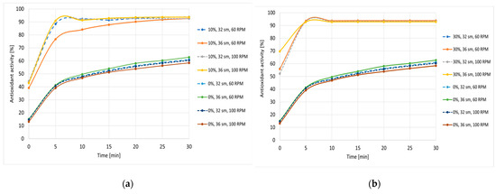 An important part of the research was the analysis of the influence of production parameters on the activity of the tested samples. Our results indicated that extrusion conditions significantly impacted the nutritional quality of the functional food products. Figure 2 presents a comparison of the antioxidant activity of snack pellets prepared at various extrusion parameters. As can be noted, there were no significant differences in antioxidant activity depending on the production conditions after the first 10 min of the reaction. A more evident impact, however, was observed if 10% of cricket flour addition was used but only if 36% of initial moisture and 60 rpm screw speed was applied during processing-for these samples, the antioxidant activity was slightly weaker.