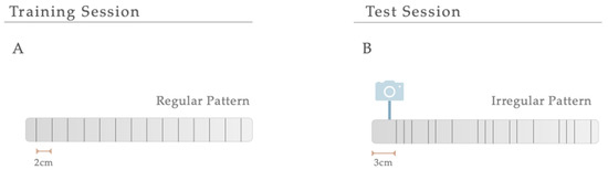 Serial Patterns. The difficulty of the manual foot misplacement corridor test was changed by varying the spacing between bars (across the entire apparatus), producing two different serial patterns. (A) A regular pattern was used for a training session, and (B) an irregular one was created for the test sessions.