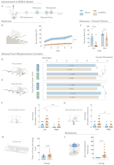 (A) Phenotypic characterization of the 6-OHDA intrastriatal PD model. Three weeks after 6-OHDA exposure, through the staircase test, motor deficits were observed with a (B) significant reduction in fine motor coordination of the 6-OHDA animals. Performing a forced-choice task, a significant impairment on both the affected side (left side) and the right side was perceived when compared to the control group (Sham; (C)). The manual foot misplacement corridor test assessed skilled walking (D–H). In the foot fault score, regarding 6-OHDA animals, the average stepping score for both limbs was significantly different from the Sham group (D,E), and statistical differences were observed in ipsilateral versus contralateral placement (D,E). Considering placement accuracy, differences between the Sham and 6-OHDA groups were only obtained in the left forelimb (F). In contrast, among 6-OHDA animals, an increased number of contralateral errors was observed in both fore- and hindlimbs (F,G). Moreover, group differences in latency to cross the apparatus (H) were subtle but not significant (p = 0.348). In the apomorphine turning behavioral test, the injection of 6-OHDA in the striatum led to a significantly higher number of net-contralateral rotations when compared with the Sham group (I), demonstrating that animals’ dopaminergic integrity was affected. Data are presented as mean ± SEM and mean ± IQR. For the tests: Sham: n = 8–9; 6-OHDA: n = 13–20. * p < 0.05, ** p < 0.01, *** p< 0.001, **** p< 0.0001. Abbreviations: FCR, forced-choice task at the right side; FCL, forced-choice task on the left side; n.s: nonsignificant; sec, seconds; 6-OHDA, 6-Hydroxydopamine.