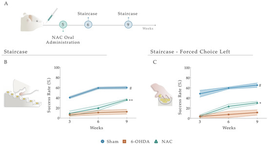 (A) Impact of NAC administration on skilled motor performance, 1 and 4 weeks after treatment administration. Under a paw-reaching test, all treated animals demonstrated a significant amelioration (p < 0.001) of forelimb coordination, with a higher success rate of eaten pellets (%) when compared to the untreated group, 6-OHDA (B). When rats were submitted to the (C) paw-reaching forced performance task, statistical analysis revealed significant effects between treated and 6-OHDA untreated animals. Data are presented as mean ± S.E.M. For the tests: Sham n = 8–9; 6-OHDA n = 8; NAC n = 8–6. * p < 0.05, ** p < 0.01; Sham animals were statistically different from all 6-OHDA injured animals: # p ≤ 0.0001. Abbreviations: NAC. N-Acetylcysteine; 6-OHDA, 6-Hydroxidopamine.