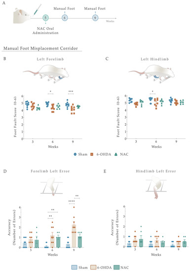 (A) Beneficial effects of NAC intervention on locomotor function, 1 and 4 weeks after treatment administration. Overall, 6-OHDA-lesioned animals showed impairments in left limb placement 6 and 9 weeks after intrastriatal injections (B,C). No signs of amelioration of these deficits were observed upon NAC administration (B,C). Regarding placement accuracy (number of errors), 6-OHDA animals exhibited an increase in the number of errors throughout the treatment weeks compared to the control group (D). Remarkably, in NAC-treated rats, the left footfall pattern of forelimbs significantly improved in this task in week 9 (D). In contrast, all groups’ error counts on the contralateral hindlimb were evenly distributed (E). Data are presented as mean ± S.E.M. For the tests: Sham n = 9; 6-OHDA n = 8; NAC n = 6. * p < 0.05, ** p < 0.01, *** p < 0.001, **** p < 0.0001. Abbreviations: NAC. N-Acetylcysteine; n.s: nonsignificant; 6-OHDA, 6-Hydroxidopamine.