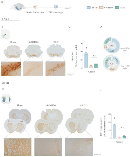 (A) Histological assessment of NAC therapeutical administration in the central dopaminergic network. Representative image of SNpc and dorsal striatum analyzed and brightfield photomicrographs of the selected brain sections stained for TH (B,E). Concerning the SNpc, all animals injected with 6-OHDA presented a significant loss of TH+ cells when compared to the Sham group (C). Pie chart illustrating the percentage of TH+ cells in the SNpc, on both ipsilateral and contralateral sides (D). TH+ neurons count revealed a general trend towards a higher distribution of these cells in the ipsilateral lesioned side of NAC-treated animals than in the 6-OHDA group (D). For the dorsal striatum (E), although 6-OHDA animals presented a marked reduction in TH+ labeling, treatment intervention with NAC did not have an impact on striatal histological deficits (p = 0.105, (F)). Data are presented as mean ± S.E.M. Sham animals were statistically different from all 6-OHDA-injured animals: # p ≤ 0.0001. Sham: n = 14–15 slices/5–6 animals; 6-OHDA: n = 16–20 slices/6 animals; NAC: n = 19–21 slices/6 animals. Abbreviations: dSTR: dorsal striatum; Ctr, contralateral; Ipsi, ipsilateral; NAC, N-Acetylcysteine; n.s: nonsignificant; SNpc: substantia nigra pars compacta; TH, tyrosine hydroxylase; 6-OHDA, 6-Hydroxydopamine. Magnification: 4× and 10×. Scale bar STR: 1000 μm. Scale bar SNpc: 10,000 μm.