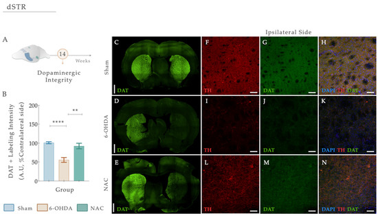 (A) N-Acetylcysteine administration re-established dopaminergic integrity. (B) Representative photomicrographs of immunofluorescence staining for the dopamine transporter (DAT) (green) in the dorsal striatum are observed (C–E). Confocal images of Tyrosine hydroxylase (TH) (red) and DAT (green) highlighting the dorsal striatum of the ipsilateral hemisphere and labeling the axonal terminals of dopaminergic neurons are shown in (F–N). A significant reduction in DAT levels was clearly visible in 6-OHDA-injected animals compared to the Sham group (B,I–K). After treatment application, NAC could modulate DAT levels compared to the 6-OHDA untreated group (B,L–M). Data presented as mean ± S.E.M. **** p ≤ 0.0001. ** p ≤ 0.01. Sham: n = 4; 6-OHDA: n = 4; NAC: n = 4. DAT, dopamine transporter; Ipsi, ipsilateral; NAC, N-Acetylcysteine; dSTR, dorsal striatum; TH, tyrosine hydroxylase; 6-OHDA, 6-Hydroxydopamine. Magnification: 4× and 20×. Scale bars: (C–E): 1000μm; (F–K): 50μm.