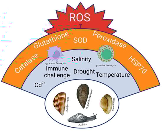 Highly invasive molluscs of different Classes present common traits of resistance versus oxidative stress that could be originated either from environmental stimuli or from immune challenges. The advantage of managing ROS increase is shared among diverse physiological responses, thus limiting the associated energy expenditure and allowing efficient energy trade-offs []. Created with BioRender.com (accessed on 2 May 2023).