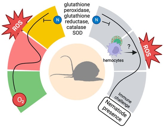 Climate change and invasive species are among the most relevant threats to biodiversity []. Invasive alien species are demonstrating an outstanding capacity to adapt to the new environment they colonize. Beside the adaptations to new physical-chemical environmental aspects, invasive species must also present a high degree of metabolic plasticity and an outstanding capacity of adaptation to new antigenic ecospaces [,]. In the IUCN list of the worst invasive species [], numerous invertebrate species are retrievable, presenting hypervariable defence-related molecules and specific anti-microbial peptides [,]. In addition to the immune features and mediators that evolved or differentiated along specific evolutionary lineages, one widespread function of the immune anti-pathogen responses is represented by the controlled production of reactive oxygen species (ROS) [,]. These volatile and short-lived molecules are of extreme importance both in invertebrate and vertebrate immune response and, thanks to their non-specificity, they can be directed against a plethora of potential pathogens. Beside this, environmental conditions can also create oxidative stress in organisms [,]. In this last case, the ROS become a menace for the organism itself, and oxidative stress must be managed in order to avoid permanent damage.