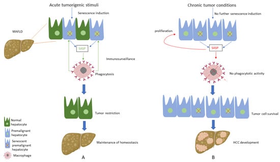Considering the above-mentioned pivotal role of CS regarding hepatocarcinogenesis, studies have focused on the factors that trigger this alteration of the CS profile. Interestingly, chronic moderate liver injury, similar to the one MAFLD causes to the liver, led to the development of HCC, while the induction of acute injury in a chronic injury environment activated hepatocellular senescence and subsequently caused HCC reduction [108], showing the detrimental impact of chronic low-intensity stressors in hepatic tumorigenesis. In this context, we suppose that hepatocytes sense initial premalignant stimuli as an acute liver injury during the early stages of HCC development; thus, induction of senescence in premalignant hepatocytes acts as a protective mechanism, leading to the clearance of premalignant cells and tumour restriction [109]. On the other hand, when tumour conditions are established following chronic moderate MAFLD-associated tumorigenic stimuli, senescence is not further activated; thus, premalignant hepatocytes do not enter this cell-cycle arrest process, thereby leading to HCC development and expansion. Furthermore, there is substantial evidence supporting that the existing senescent hepatocytes, instead of promoting immunosurveillance, seem to induce aberrant proliferation of the adjacent hepatocytes via SASP secretion; thus, abnormal proliferation of hepatocytes favours hepatic carcinogenesis [108] (Figure 1).