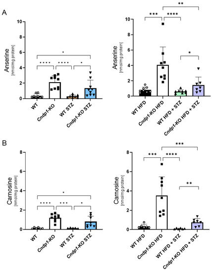 | nmol/mg Protein | WT | Cndp1-KO | p (vs. WT) | WT STZ | p (vs. WT) | Cndp1-KO STZ | p (vs. WT STZ) | |||