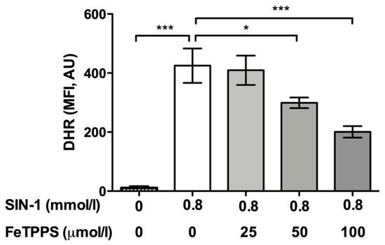 Analysis of FeTPPS as a peroxynitrite decomposition catalyst. Human spermatozoa were exposed to 0.8 mmol/L of 3-morpholinosydnonimine (SIN-1) in order to generate peroxynitrite in sperm suspensions. Different concentrations of FeTPPS were also added, and the sperm cells were incubated for 4 h at 37 °C. A control of spermatozoa exposed to 0.8 mmol/L of SIN-1 and an untreated control were included. The level of peroxynitrite was evaluated by the fluorescent compound dihydrorhodamine 123 (DHR). The results are presented as the mean ± SD of six different experiments. (*) p < 0.05, (***) p < 0.0001 compared to the control treated only with SIN-1. MFI, mean fluorescence intensity; AU, arbitrary units.