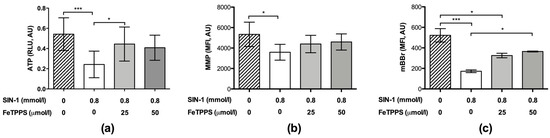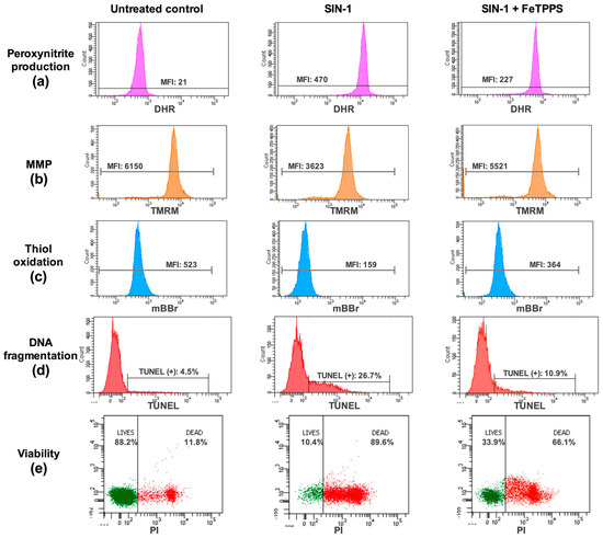 In the same way, the MMP analysis showed that the exposure to SIN-1 caused a decrease in this parameter (Figure 5b); however, in the spermatozoa exposed to SIN-1 plus FeTPPS, no significant differences were observed compared to the untreated control (Figure 5b). Representative flow cytometry histograms of TMRM fluorescence including the untreated control, sperm exposed to SIN-1, and sperm exposed to SIN-1 plus FeTPPS are in Figure 2b.