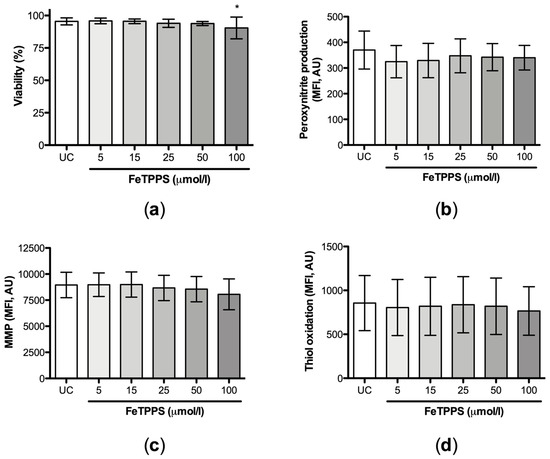 Then, the individual effect of FeTPPS on sperm quality was evaluated. The results showed that the exposure of human spermatozoa to FeTPPS up to 50 μmol/L for 4 h at 37 °C did not impair sperm viability (Figure 3a). Additionally, the antioxidant FeTPPS at concentrations up to 100 μmol/L did not affect peroxynitrite production (Figure 3b), MMP (Figure 3c), or thiol status (Figure 3d). Considering these results, concentrations up to 50 μmol/L, which do not affect sperm viability, were used to perform the following experiments.