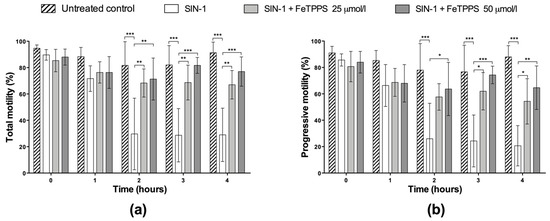 In order to evaluate the beneficial effect of FeTPPS on sperm cells subjected to nitrosative stress conditions, the effect of FeTPPS on motility, ATP levels, MMP, and thiol oxidation in spermatozoa exposed to peroxynitrite was evaluated. For the experiments, aliquots of sperm suspension at 2 × 106 mL−1 were exposed to 0.8 mmol/L of SIN-1 in human tubular fluid (HTF) medium supplemented with different concentrations of FeTPPS (25 and 50 µmol/L) for 4 h at 37 °C. A control of spermatozoa exposed to 0.8 mmol/L of SIN-1 and an untreated control were included. The concentration and incubation time with SIN-1 were selected based on previous reports that demonstrated a decrease in these parameters under these experimental conditions [12,13,15].