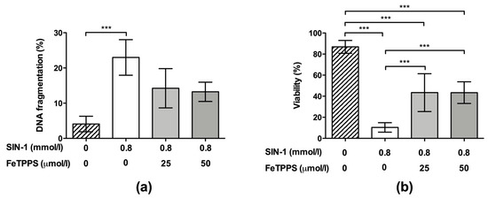 Regarding the sperm viability, this parameter was significantly decreased after exposure to 0.8 mmol/L of SIN-1 for 24 h when compared to the untreated control (10.38 ± 4.4 vs. 86.85 ± 6.1, respectively, p < 0.0001). However, spermatozoa incubated with 0.8 mmol/L of SIN-1 in a medium supplemented with 25 and 50 μmol/L of FeTPPS evidenced a less accentuated decrease in this parameter, and a significantly higher viability compared to that of the control spermatozoa treated only with 0.8 mmol/L of SIN-1 was observed (Figure 6b). Representative flow cytometry histograms of TUNEL and viability analysis are in Figure 2d,e, respectively.