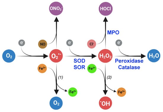 Figure 1. Superoxide (O2•−), hydrogen peroxide (H2O2), and hydroxyl radical (OH) are reactive oxygen species (ROS) produced by the subsequent reduction in dioxygen (O2). In living organisms, the dismutation or reduction in superoxide, catalyzed by superoxide dismutase (SOD) and reductase (SOR), respectively, gives rise to hydrogen peroxide. Peroxidases and catalase catalyze the hydrogen peroxide reduction or dismutation, respectively, into water. Superoxide can react with nitric oxide (NO) to form peroxinitrite (ONO2), and hydrogen peroxide can be transformed into hypochlorous acid (HOCl) in a reaction catalyzed by myeloperoxidases (MPO). The reactions (1) and (2) constitute the Haber–Weiss reaction that produces dioxygen and hydroxyl radical from superoxide and hydrogen peroxide, respectively. The reaction (2) is the Fenton reaction. Created with BioRender (BioRender.com).