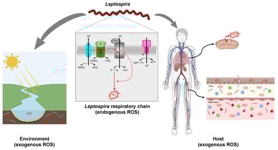 Figure 2. Exposition of Leptospira to ROS. Leptospira spp. are potentially exposed to ROS produced endogenously as a result of electron leakage from the respiratory chain. The putative complexes forming the respiratory chain in pathogenic Leptospira, complex I (encoded by LIMLP_00745-00750, LIMLP_03705-03760 in L. interrogans serovar Manilae), complex II (encoded by LIMLP_09980-09990 in L. interrogans serovar Manilae), complex IV (encoded by LIMLP_01080-01085, LIMLP_01375, LIMLP_01100-01110 in L. interrogans serovar Manilae), and complex V (encoded by LIMLP_06045-06080 in L. interrogans serovar Manilae) are represented. Leptospira spp. also face ROS produced in the environment (waters and soils). In addition, pathogenic species are exposed to ROS produced by the host phagocytic cells or tissues. The host mitochondria are one of the main ROS producers. Created with BioRender (BioRender.com).