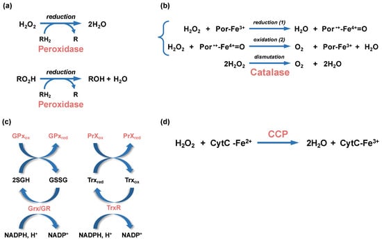Figure 3. Enzymatic reactions leading to peroxide detoxification. (a) Hydrogen peroxide (H2O2) and alkyl peroxides (RO2H) are reduced by peroxidases (peroxiredoxin or glutathione peroxidases), with the participation of an organic electron donor (RH2). (b) The dismutation of H2O2 into water and dioxygen (O2) by heme-using catalases is a two-step reaction. In a first step (1), one molecule of H2O2 is reduced into water in a reaction where the heme ferric porphyrin (Por-Fe3+) acts as an electron donor and is oxidized into an oxoferryl porphyrin cation radical (Por•+-Fe4+=O). In a second step (2), a second molecule of H2O2 is oxidized into O2, allowing the regeneration of the ferric porphyrin. (c) Glutathione peroxidases (GPx) and glutaredoxin (Grx), which are oxidized during peroxide reduction or glutathionylation, use glutathione (GSH) as cofactors to regenerate their reduced forms, whereas the oxidized peroxiredoxin (PrXox) is reduced by thioredoxin (Trx). The glutathione disulfide (GSSG) and oxidized thioredoxin (Trxox) produced during these reactions are reduced by the glutathione reductase (GR) and thioredoxin reductase (TrxR), respectively. The NADPH/NADP+ is the redox couple involved in these reactions. (d) A simplified H2O2 reduction reaction by cytochrome C peroxidase (CCP) is represented. The CCP-bound heme is first reduced by the cytochrome C (CytC-Fe2+). The activated CCP reduces H2O2 into 2 molecules of H2O using the electron of its reduced heme.