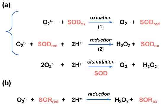 Figure 5. Enzymatic reactions leading to superoxide detoxification. (a) Superoxide dismutase (SOD)-catalyzed dismutation of O2•−. O2•− is oxidized into O2 (reaction 1) and reduced into H2O2 (reaction 2). In these reactions, SOD is interconverted between an oxidized (SODox) and reduced (SODred) forms. (b) Superoxide reductase (SOR)-catalyzed reduction in O2•−. During the reduction of O2•− into H2O2, reduced SOR (SORred) is converted into an oxidized form (SORox).