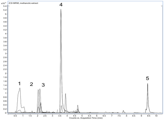 HPLC chromatogram of G. Verum methanol extract: compound 1—Chlorogenic acid; compound 2—Cynaroside; compound 3—Quercetin-3-O-glucoside; compound 4—Quercetin; compound 5—Luteolin.
