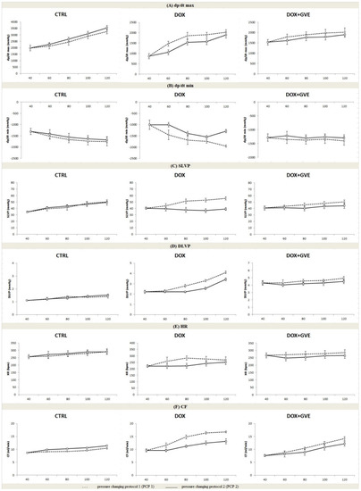 In addition, DOX treatment significantly changed HR during PCPs at 80 cm H2O (−21.46), as well as CF at 80 cm (−24.32), 100 cm (−23.78), and 120 cm H2O (−22.02).