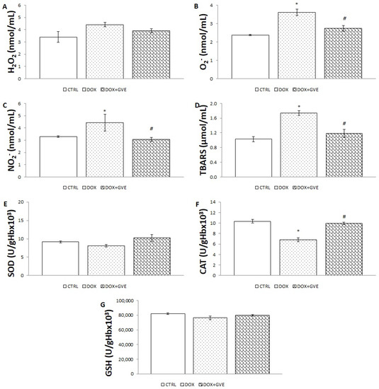 Effects of consumption of G. verum extract on the systemic oxidative stress parameters: (A) H2O2; (B) O2−; (C) NO2−; (D) TBARS; (E) SOD; (F) CAT; (G) GSH. Values are expressed as median. The upper bar shows the value of the third quartile and lower bar shows the first quartile (n = 8). * p < 0.05 compared to CTRL group; # p < 0.05 compared to DOX group.