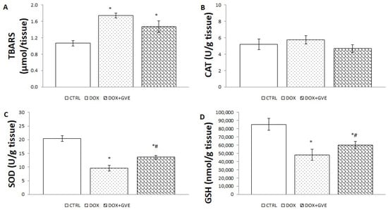Following a single DOX injection, the value of the pro-oxidative marker TBARS in the heart tissue was significantly higher in groups treated with DOX in comparison to the CTRL group. As a result of the DOX administration, the antioxidant defense system was weakened. SOD activity and the level of GSH were reduced in both DOX groups compared to the CTRL group. On the other hand, it is obvious that these parameters are higher in rats treated with GVE followed by DOX injection compared to DOX administration alone (Figure 4).
