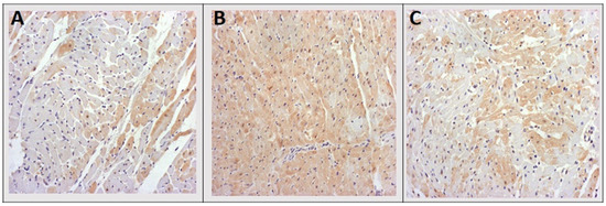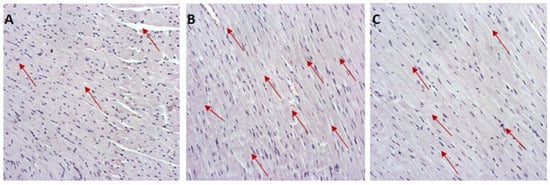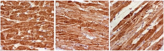 cTnT-immunostaining: (A) CTRL group; (B) DOX group; (C) DOX + GVE group. Original magnification 20×. Red arrow indicates the area with the least colored cTnT in the heart tissue.