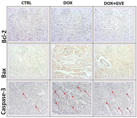 Representative heart tissue sections of Bcl-2, Bax and Caspase-3 staining in CTRL, DOX and DOX + GVE groups. Original magnification 20×.