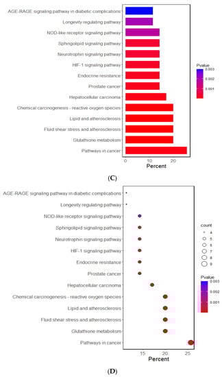 The Gene Ontology (GO) and Kyoto Encyclopedia of Genes and Genome (KEGG) analyses investigated the potential functional and molecular mechanisms of these 11 genes linked to T2DM and oxidative stress. The pathways enriched with these genes are displayed in Figure 1. The GO analysis revealed that the biological process linked to oxidative stress was mainly linked to the selected genes. The GO revealed that 10 pathways were significantly associated with the selected genes by 11.4–28.6% in the relevant biological process of GO at the p-value of the Bonferroni correction (p < 0.05). The predominant pathways were cellular detoxification, cell redox homeostasis, response to oxidative stress, and negative regulation of apoptosis and inflammatory response (Figure 1A,B). In the KEGG analysis, the genes were associated with 14 pathways, including cancer, glutathione, atherosclerosis, lipid metabolism, and endocrine resistance (mainly insulin resistance) (Figure 1C,D). These results suggest that the genetic variants related to T2DM risk were linked to oxidative stress and the antioxidant system.