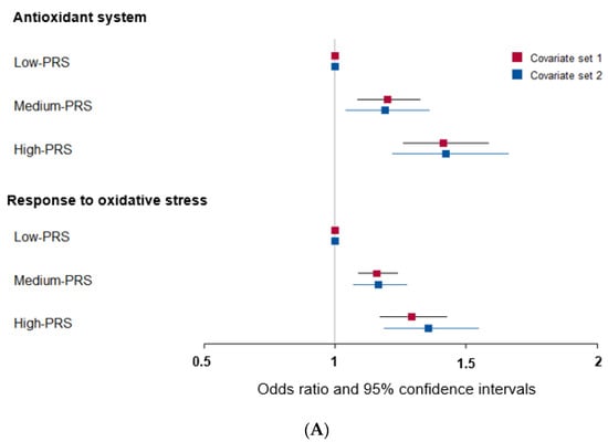 PRSs for the response to oxidative stress and the antioxidant system were calculated by summing the number of the risk alleles from each selected SNP in the allelic genetic model [31,32,33]. The PRSs indicated the genetic risk for T2DM associated with oxidative stress or the antioxidant system. The PRS for the response to oxidative stress was divided into three categories: low PRS (<8), medium PRS (8–9), and high PRS (>9). The PRS values for the antioxidant system were divided into three categories: low PRS (<9), medium PRS (9–11), and high PRS (>11). The high PRS group had the highest genetic risk for T2DM linked to oxidative stress or antioxidant system. The PRS categories enabled a more detailed understanding of the interplay between genetic variants related to oxidative stress and the antioxidant defense system in the development of T2DM. The PRS was calculated in dominant and recessive genetic models. Heterozygotes were considered a risk group in the dominant genetic model, while they were a non-risk group in the recessive genetic model.