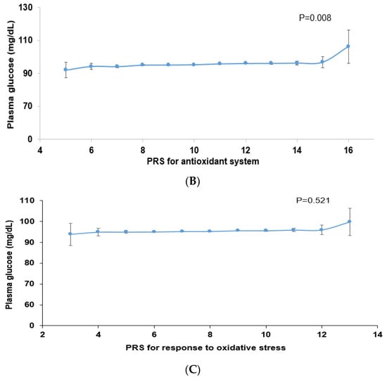 The PRS related to the antioxidant system was selected for further analysis since the linear regression of plasma glucose concentration was positively significantly different from the PRS of the antioxidant system (p < 0.0001) but not the PRS of the response to oxidative stress (p = 0.053). The antioxidant system was linked more to lifestyle factors than the response to oxidative stress. Since the PRS was generated from the genetic variants in the antioxidant system, its interaction was determined mainly with antioxidant-related food parameters such as PBD, DII, bioactive compounds (sum of quercetin, luteolin, genistein, daidzein, and cyanidin), vitamin D, coffee, and smoking status (Table 5). The PRS influenced the plasma glucose concentrations in the subjects with a high PBD intake compared to those with a low PBD intake (Table 5, Supplementary Figure S2A). In participants with an intake of foods with a high DII, the plasma glucose concentrations were positively associated with the PRS (Supplementary Figure S2B). However, the positive association between the PRS and DII was lower in those with a low-DII food intake than in those with a high-DII food intake (Table 5). The plasma glucose concentrations were lower in the low-DII than in the high-DII food intake subjects (Supplementary Figure S2B). Among the components of PBD, bioactive compounds, DII, vitamin C, vitamin D, and coffee intake showed an interaction with the PRS and influenced plasma glucose concentrations (Table 5). In subjects with a low bioactive compound intake, the plasma glucose concentrations were higher than in those with a high intake of bioactive compounds. They were not associated with the PRS in subjects with a high intake of bioactive compounds (Supplementary Figure S2C). In subjects with a low vitamin C and D intake, the plasma glucose concentrations were higher than in those with a high intake, and they were not significantly associated with the PRS (Table 5). However, in the subjects with a high vitamin C and D intake, the plasma glucose concentrations were positively linked to the PRS (Supplementary Figure S2D,E). In the group with a high coffee intake, participants with a high PRS showed a higher plasma glucose concentration than those with a low coffee intake (Table 5; Supplementary Figure S2F). Smoking had the greatest impact on the PRS interactions; the plasma glucose concentrations were much lower in nonsmokers than in former and current smokers regardless of the PRS; in former and current smokers, they were positively associated with the PRS (Table 5; Supplementary Figure S2G). Therefore, it is recommended that adults with a high PRS for the antioxidant system should increase their intake of PBD containing high levels of bioactive compounds, as well as vitamins C and D, whereas those with a low PRS could increase their coffee intake.