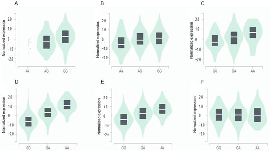 Genotype-Tissue Expression (GTEx) of genes according to their mutation. (A) GPX3_ rs8177426 in the cortex of the brain (β = 0.26, p = 0.0015). (B) GPX3_ rs8177426 in the left ventricle of the heart (β = 0.21, p = 9.1 × 10−7). (C) GGT1_ rs2076999 in the liver (β = 0.36, p = 2.7 × 10−7). (D) GGT1_ rs2076999 in the pancreas (β = 0.81, p = 1.4 × 10−35). (E) GGT1_ rs2076999 in the thyroid (β = 0.55, p = 8.8 × 10−57). (F) GGT1_ rs2076999 in the tibial nerve (β = −0.15, p = 0.00032). Abbreviations: GPX, glutathione peroxidase; GGT1, gamma-glutamyltransferase 1.
