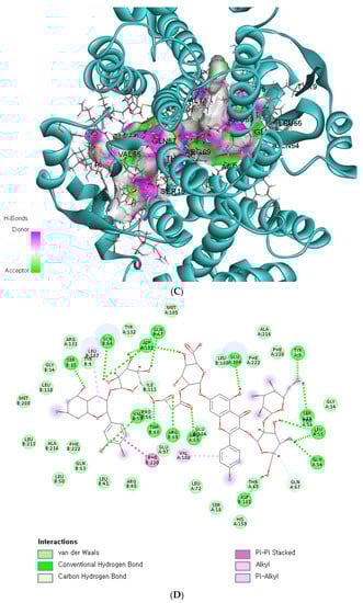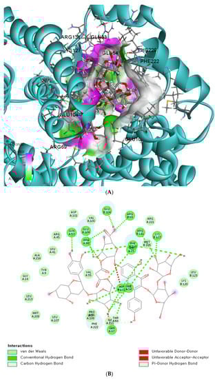 Since the missense mutation was observed only in the GSTA5 gene, we conducted an in silico analysis to assess the functional implications of the wildtype and mutated versions of GSTA5_rs7739421. This analysis revealed how the mutated variants of GSTA5_rs7739421 may influence the potential function of the GSTA5 protein, specifically in relation to exogenous antioxidants, which can be applied to personalized nutrition. GSTA5_rs7739421 (missense mutation) has two alleles: C and T were converted from valine (Val; C) to leucine (Leu, T) at position 55, and T was the risk allele for T2DM. The active site of the GSTA5 proteins having Val or Leu at 55 had low binding energy (<−10 kcal/mol) with some bioactive components, particularly flavonoids and anthocyanins (Table 4). The proteins with Val or Leu at 55 exhibited the same bioactive compounds with similar or different binding energy. Asterlingulatoside D, kaempferol 3-O-rhamnosyl-rhamnosyl-glucoside, and (cyanidin 3-O-beta-glucoside)(kaempferol 3-O-(2-O-beta-glucosyl-beta-glucoside)-7-O-beta-glucosiduronic acid) malonate (CK-malonate) had low binding energy only with the active site of the GSTA5 protein having Leu at 55 (Table 4).