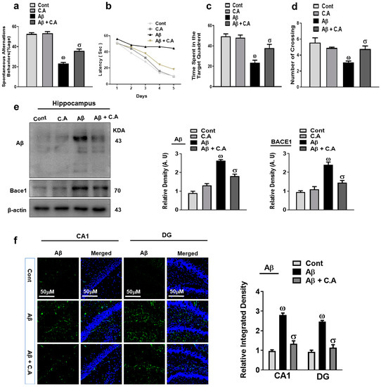 Neuroprotective effect of caffeic acid on memory functions Aβ and BACE-1 expression. (a) Percentage of spontaneous alteration behavior of experimental mice in the Y-maze. (b) Average escape latency to reach the hidden platform until day 5. (c) Time spent by the mice in the quadrant where the platform was present in training; (d) represents the probe test. (e) Western blot analysis of Aβ and BACE-1 in the experimental animal’s hippocampus. The bands were quantified using ImageJ software and the difference is shown by their respective histogram. β-actin was used as a loading control. (f) Confocal microscopy of Aβ and representative histogram and DAPI staining (blue) in the hippocampus (Cornu Ammonis (CA1) and Dentate Gyrus (DG regions) of adult mice. The density values are relative to those in the control group and are expressed in arbitrary units (AU), magnification 10×, scale bar = 50 μm. The data are presented as the mean ± SEM of 4 mice/group for Western blot and 4 mice/group for confocal microscopy, and are representative of three independent experiments. ω indicates a significant difference from saline-injected control mice; σ indicates a significant difference from Aβ1–42-injected mice. Significance = ω p < 0.05, σ p < 0.05.