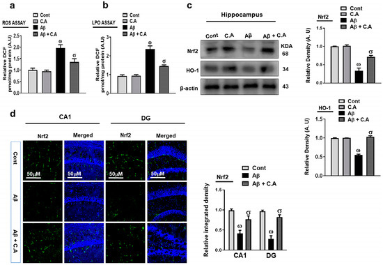 Effects of caffeic acid on oxidative stress. (a,b) Representative histograms showing ROS and LPO in the experimental mice brain hippocampus. (c) Analysis of the protein expression in Nrf2 and HO-1 by immunoblotting in the mouse hippocampus. Using ImageJ software, the bands were quantified, and the difference is displayed by the histogram for each band. β-actin was used as a loading control. (d) Immunofluorescence of Nrf2 and representative histogram and DAPI staining (blue) in the hippocampus (Cornu Ammonis (CA1) and Dentate Gyrus (DG regions) of adult mice. The density values are relative to those in the control group and are expressed in arbitrary units (AU), magnification 10×, scale bar = 50 μm. The data are presented as the mean ± SEM of 4 mice/group for Western blot and 4 mice/group for confocal microscopy and are representative of three independent experiments. ω indicates a significant difference from saline-injected control mice; σ indicates a significant difference from Aβ1–42-injected mice. Significance = ω p < 0.05, σ p < 0.05.