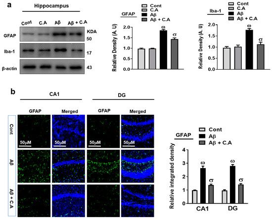 Caffeic acid reduced the activation of glial cells. (a) Western blot examination of GFAP and Iba-1 of mice’s hippocampus. The bands were quantified using ImageJ software and the difference showed by their respective histogram. β-actin was used as a loading control. (b) Confocal microscopy analysis of GFAP (green) and representative histogram and DAPI staining (blue) in the hippocampus of adult mice. The density values are relative to those in the control group and are expressed in arbitrary units (AU), magnification 10×, scale bar = 50 μm. The data are presented as the mean ± SEM of 4 mice/group for Western blot and 4 mice/group for confocal microscopy, and are representative of three independent experiments. ω indicates a significant difference from saline-injected control mice; σ indicates a significant difference from Aβ1–42-injected mice. Significance = ω p < 0.05, σ p < 0.05.