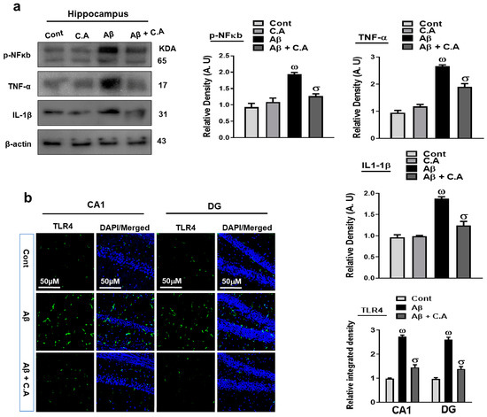 Effects of caffeic acid on inflammatory markers. (a) Western blot analysis of p-NFκB, TNF-α, and IL-1β in the brain of adult mice. The bands were quantified using ImageJ software and the difference showed by their respective histogram. β-actin was used as a loading control. (b) Immunofluorescence analysis of TLR4 (green), along with its respective histogram, and DAPI staining (blue) in the hippocampal of adult mice. The density values are relative to those in the control group and are expressed in arbitrary units (AU), magnification 10×, scale bar = 50 μm. The data are presented as the mean ± SEM of 4 mice/group for Western blot and 4 mice/group for confocal microscopy, and are representative of three independent experiments. ω indicates a significant difference from saline-injected control mice; σ indicates a significant difference from Aβ1–42-injected mice. Significance = ω p < 0.05, σ p < 0.05.