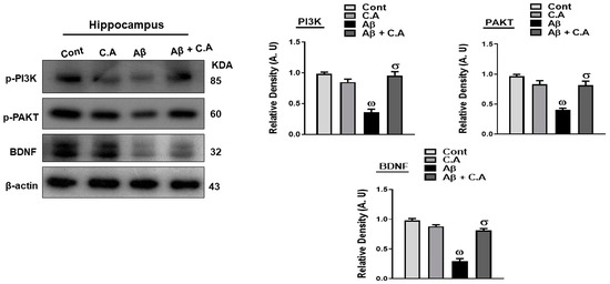 Effects of caffeic acid on p-PI3k/p-AKT and BDNF in Aβ-injected mice brains. Western blot analysis of p-PI3k, p-AKT, and BDNF, in different experimental mice groups. Using ImageJ software, the bands were quantified and the difference is shown by their respective histogram. β-actin was used as a loading control. The data are presented as the mean ± SEM of 4 mice/group for Western blot and are representative of three independent experiments. ω indicates a significant difference from saline-injected control mice; σ indicates a significant difference from Aβ1–42-injected mice. Significance = ω p < 0.05, σ p < 0.05.