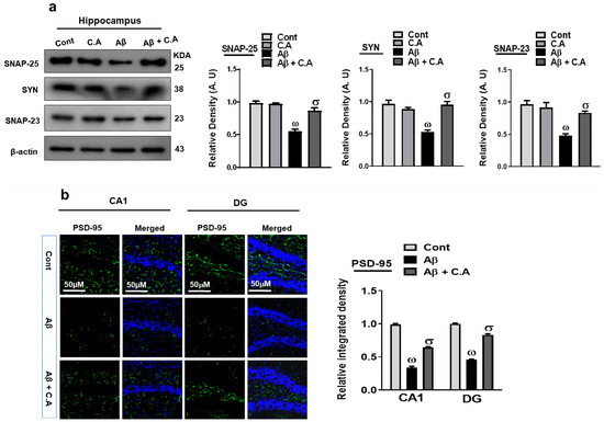 Neuroprotective properties of caffeic acid on synaptic protein expression. (a) Western blot analysis of synaptic proteins synaptosomal-associated protein 25 (SNAP-25) synaptophysin, and SNAP-23 proteins. ImageJ software was used to quantify the bands, and the difference is shown by their respective histogram. β-actin was used as a loading control. (b) Immunofluorescence analysis of postsynaptic density protein-95 (PSD-95) (green), along with its respective histogram, and DAPI staining (blue) in the brain (hippocampus). The density values are relative to those in the control group and are expressed in arbitrary units (AU), magnification 10×, scale bar = 50 μm. The data are presented as the mean ± SEM of 4 mice/group for Western blot and 4 mice/group for confocal microscopy, and are representative of three independent experiments. ω indicates a significant difference from saline-injected control mice; σ indicates a significant difference from Aβ1–42-injected mice. Significance = ω p < 0.05, σ p < 0.05.