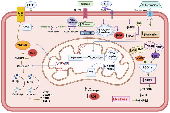 Metabolic changes in the endothelial cell. The endogenous increased cytokines act through the Toll-like receptors (TLRs) to activate NF-kB—NLRP3 inflammasome pathway. Under conditions of hyperglycemia, the accumulation of reducing equivalents (NADH+H, FADH2) feeds the respiratory chain with electrons, which leads to greater electron escape and increased superoxide radical (O2−•) production. The increment of polyol pathway leads to Advanced glycation end products (AGEs) accumulation, which act on the AGEs receptors (RAGE), leading to the activation of pro-oxidative enzymes, such as NAD(P)H oxidase, and decrement of NRF2, one important component of the anti-oxidative system of the cell. Increased β-oxidation upon the excess of fatty acid contributes to the accumulation of D-acyl glycerol, thus conducing to the activation of protein kinase C (PKC). The translocation of NF-κB to the nucleus activates the transcription of its target genes, including pro-IL-1, pro-il-18, and Pro-Caspase 1. The activation of NLRP3 inflammasome facilities the cleavage of the pro-Caspase 1 into its active form Caspase1, which in turn transforms IL-1β and IL-18 into their active forms. Subsequently, IL-18 induces the production of TNF-λ, which in turn promotes the synthesis and release of IL-6 and C reactive protein (CRP) (not shown). At the same time, the production of adhesion molecules is activated: vascular adhesion molecule-1 (VCAM-1), platelet-derived grown factor (PDGF), and vascular endothelial grown factor (VEGF). The endoplasmic reticulum (ER) stress contributes to the trigger for NLRP3 inflammasome activation and potentiating oxidative stress.