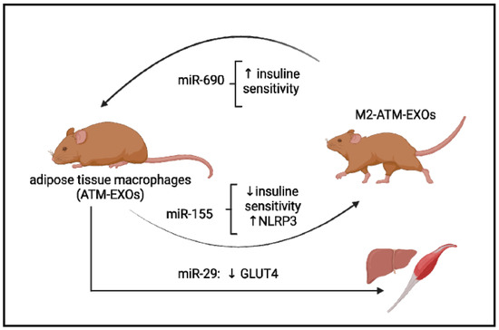 Some examples of the exosome’s microRNAs’ participation in the pathogenesis of metabolic diseases. Exosomes derived from adipose tissue macrophages, designated ATM-EXO, isolated from obese mice have been shown to confer insulin resistance and glucose intolerance when injected into lean mice (achieved in miR-155). ATM-derived miR-29 can transfer to myocytes, hepatocytes, and adipocytes, causing insulin resistance in vivo. miR-690, abundant in exosomes of anti-inflammatory M2-like macrophages, repolarized ATM-EXO towards an anti-inflammatory M2-like phenotype.
