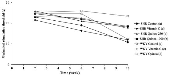 3.3. Effect of Red Quinoa Hydrolysate Administration on Tactile Sensitivity