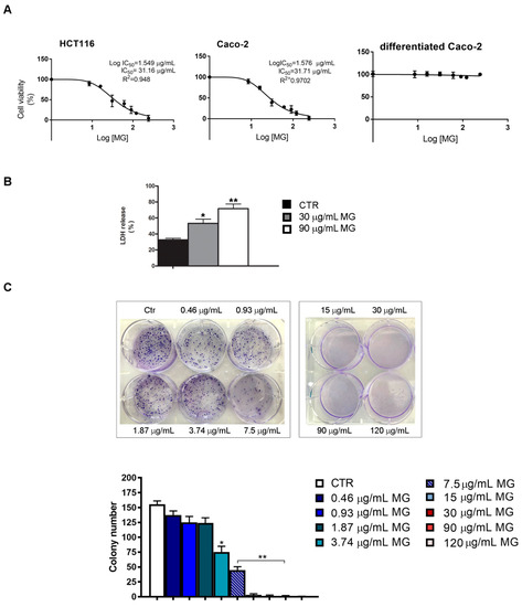 IC50 determination and colony formation assay of MG-treated colon cancer cells. (A) MTT assay of colon cancer cells (HCT116 and Caco-2) and differentiated Caco-2 cells incubated with incremental doses of MG. Cell viability was determined at 48 h as reported in the Materials and Methods section. IC50 values were assessed using GraphPad Prism 7 software. (B) LDH cytotoxicity test in MG-treated HCT116 cells. After incubation in the presence or absence of the phytocompound, cells were centrifuged and supernatants were used to assess the LDH content using a commercial kit. Data are reported as a percentage of the total LDH released from cells using as a positive control of cells incubated with 0.1% Triton 100×. (C) Clonogenic assay in MG-treated HCT116 cells. The colony formation inhibition was assessed by crystal violet staining after 10 days of exposure to MG. Representative images of colony formation are reported in the upper panel. The quantitative analysis of colonies (lower panel) was performed as reported in the Materials and Methods section. All experiments were performed in triplicate. (*) p < 0.05 and (**) p < 0.01 compared with the untreated sample.