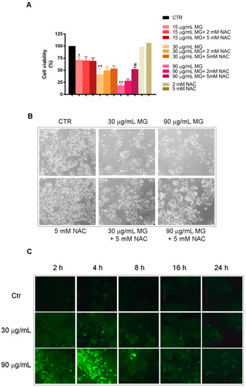 As reported in Figure 2A, when pre-incubating the cells in the presence of NAC for 2 h, the toxic effect of 90 μg/mL MG was consistently counteracted. Moreover, all morphological changes induced by MG, consisting of cell shrinkage and a reduction in cell number (Figure 2B), were also counteracted by NAC sustaining the induction of oxidative damage.